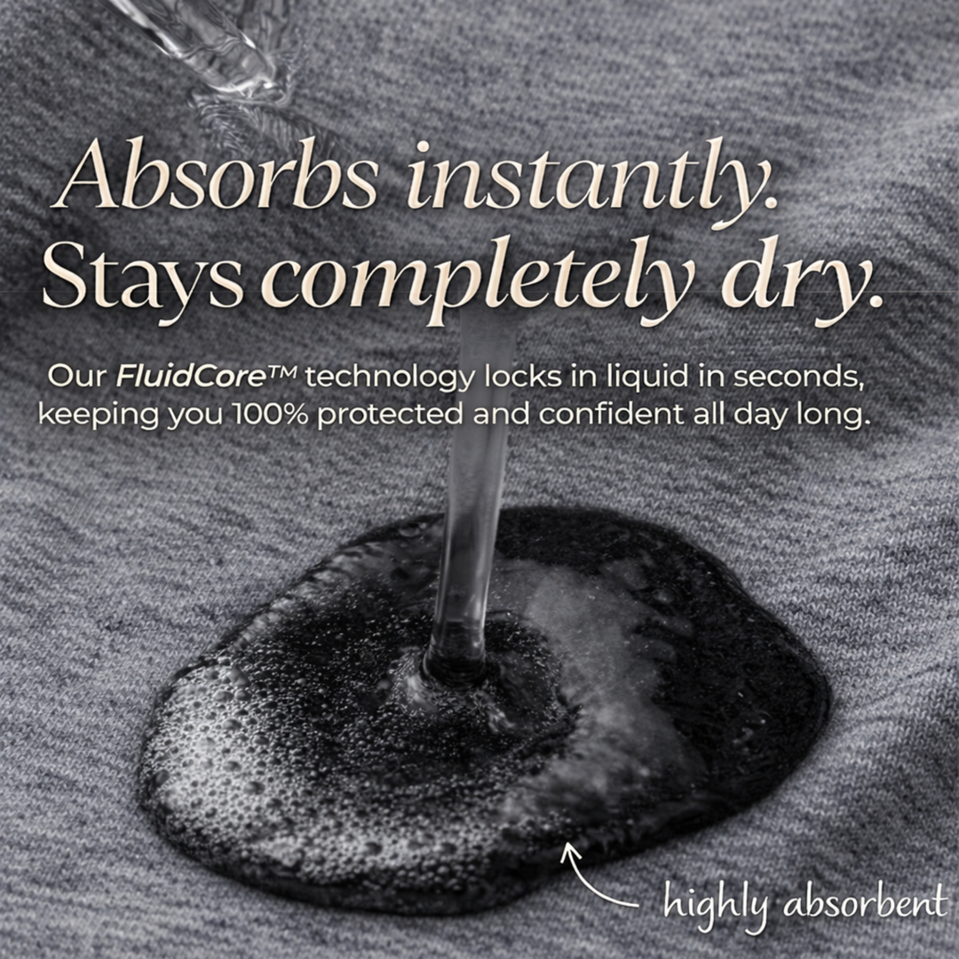 The technology behind our leakproof comfort. FluidCore™ absorbs fast, blocks leaks instantly, and stays breathable, so you feel dry, soft, and confident all day.
